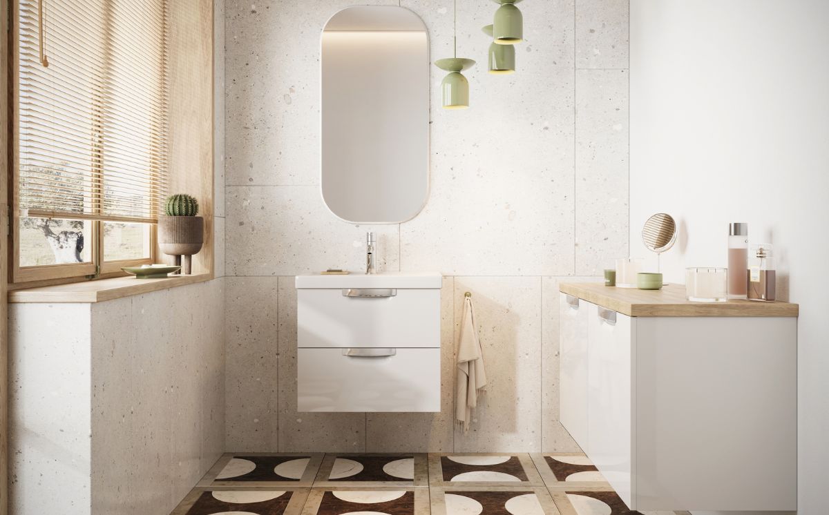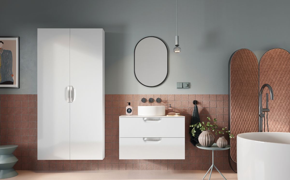 Match different pieces with functional countertops and fashionable washbasins. Open wall cubes, cabinets or hidden laundry basket provide a wide array of options for arranging your own dream bathroom.