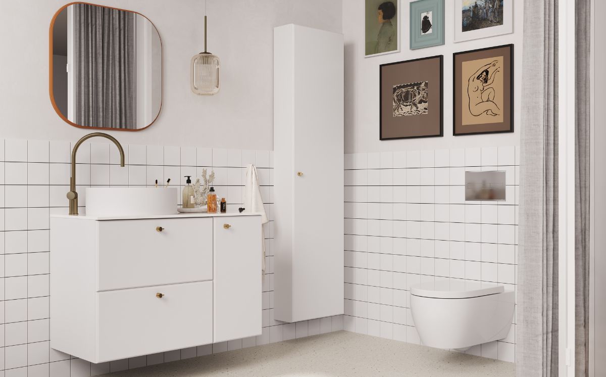 White furniture is a great option for any bathroom. Combined with gold accessories – Twig handles, faucet and lamp, they look very stylish.