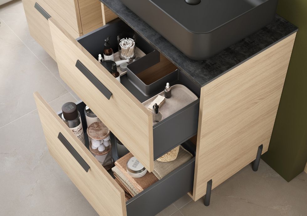 Each drawer features a full extension and soft-close function. Also noteworthy are the slim, high side walls, which make storage much more convenient.