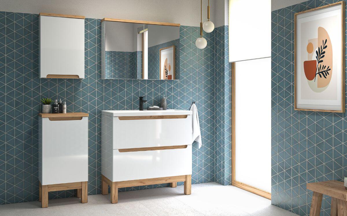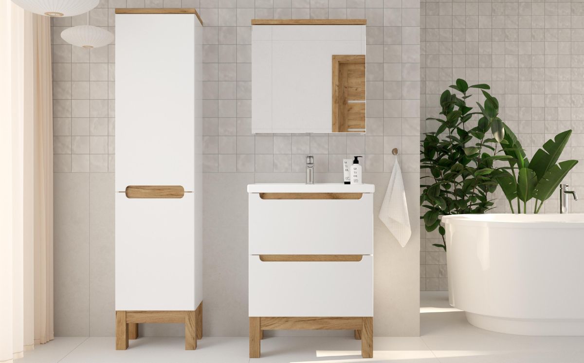 SPACE SYSTEM furniture successfully combines aesthetics with functionality. White, glossy fronts and sides as well as decorative legs, countertops and strip covers in the colour of golden oak bring a cosy character, warmth and harmony to the bathroom.