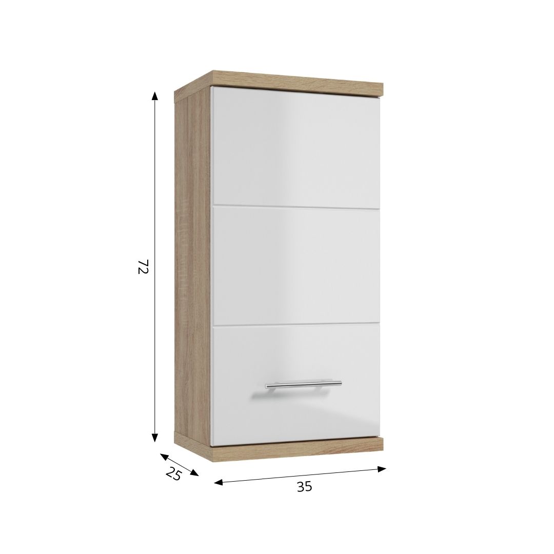 Hanging cabinet BARI A35 with width 35,1 cm. and height 71,8 cm. The cabinet with doors and internal shelves with adjustable height. The front of the locker is finished with a UV resistant lacquer in white gloss. Cabinet doors are made of solid MDF board, decorated with decorative milling, giving the cabinet a geometric character. The carcass is made of board in oak sonoma decor. The cabinet has practical rail handles. Doors may be installed in such a way that they open to the right or left side, depending on the need.