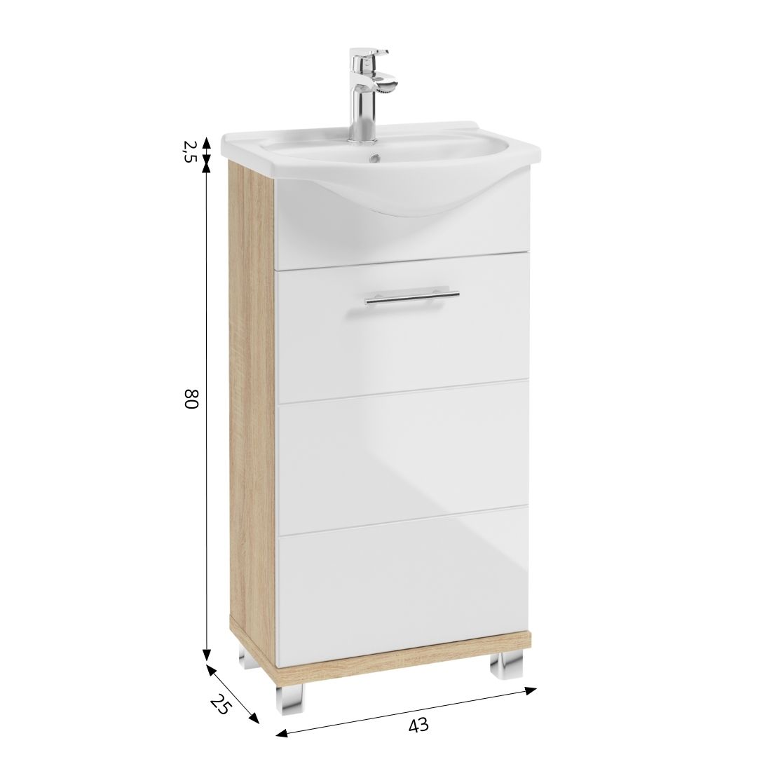 BARI B35 cabinet standing on legs, 35,1 cm wide and 74,3 cm high. The cabinet has three drawers whose fronts have been finished with a UV resistant lacquer in white gloss. Decorative frets, giving the cabinet a geometric character are made of solid MDF board on fronts. The bodies are made of board in oak sonoma decor. The cabinet has practical rail handles. ROBERTO 45 washbasin is dedicated to the cabinet and should be bought separately.