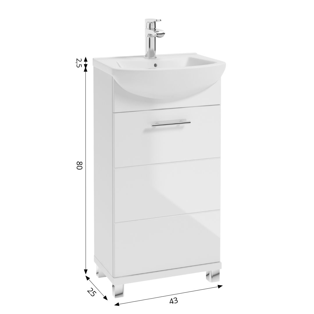 BARI B35 cabinet standing on legs, 35,1 cm wide and 74,3 cm high. The cabinet has three drawers whose fronts have been finished with a UV resistant lacquer in white gloss. Decorative frets, giving the cabinet a geometric character are made of solid MDF on the fronts. The bodies are made of white laminated board. The cabinet has practical rail handles.