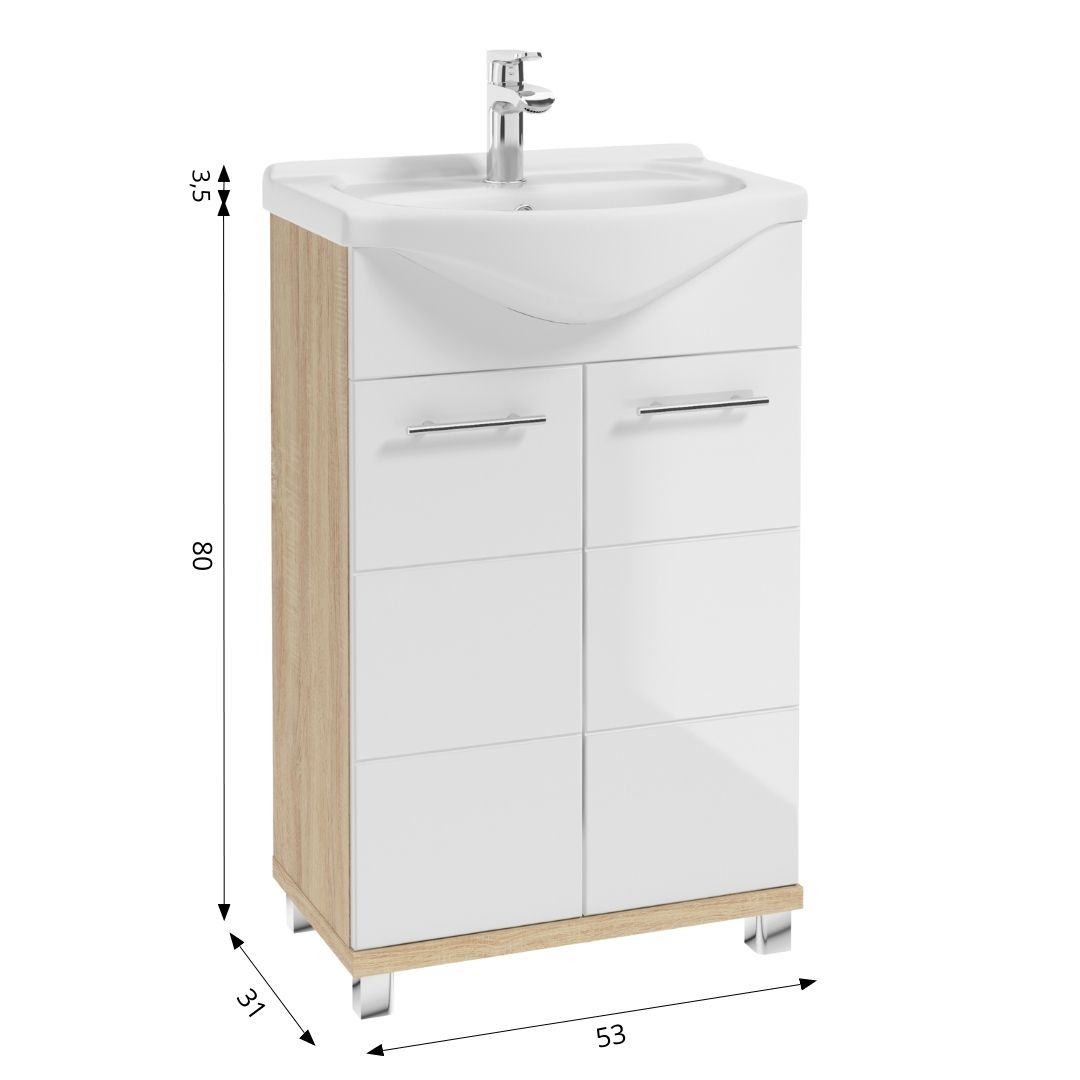 Washbasin cabinet BARI D55 width 52,7 cm. on legs. The cabinet has two doors and internal shelves with adjustable height. The front of the cabinet shall be finished with a UV resistant lacquer in white gloss. Cabinet doors are made of solid MDF board, decorated with decorative milling, giving the cabinet a geometric character. The carcass is made of board in oak sonoma decor. The cabinet has practical rail handles. The furniture presents itself perfectly with the dedicated ROBERTO 55 washbasin which should be bought separately.