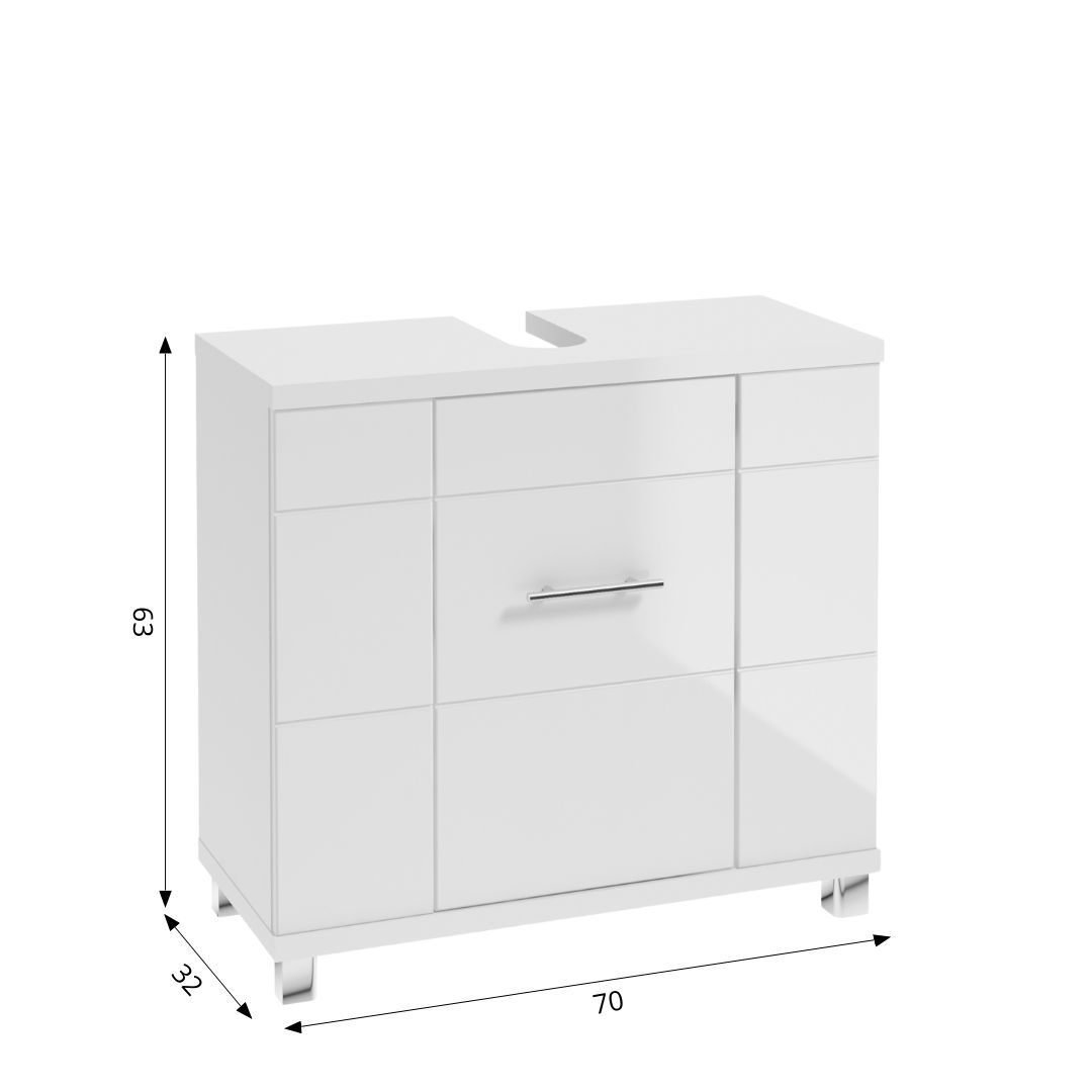 Washbasin cabinet BARI D70, 70.1 cm wide, on legs. The cabinet has doors and internal shelves of adjustable height. The front of the locker is finished with a UV-resistant lacquer in white gloss. Cabinet doors are made of solid MDF, decorated with decorative milling, giving the cabinet a geometric character. The carcass is made of white laminated board. The cabinet has practical rail handles.