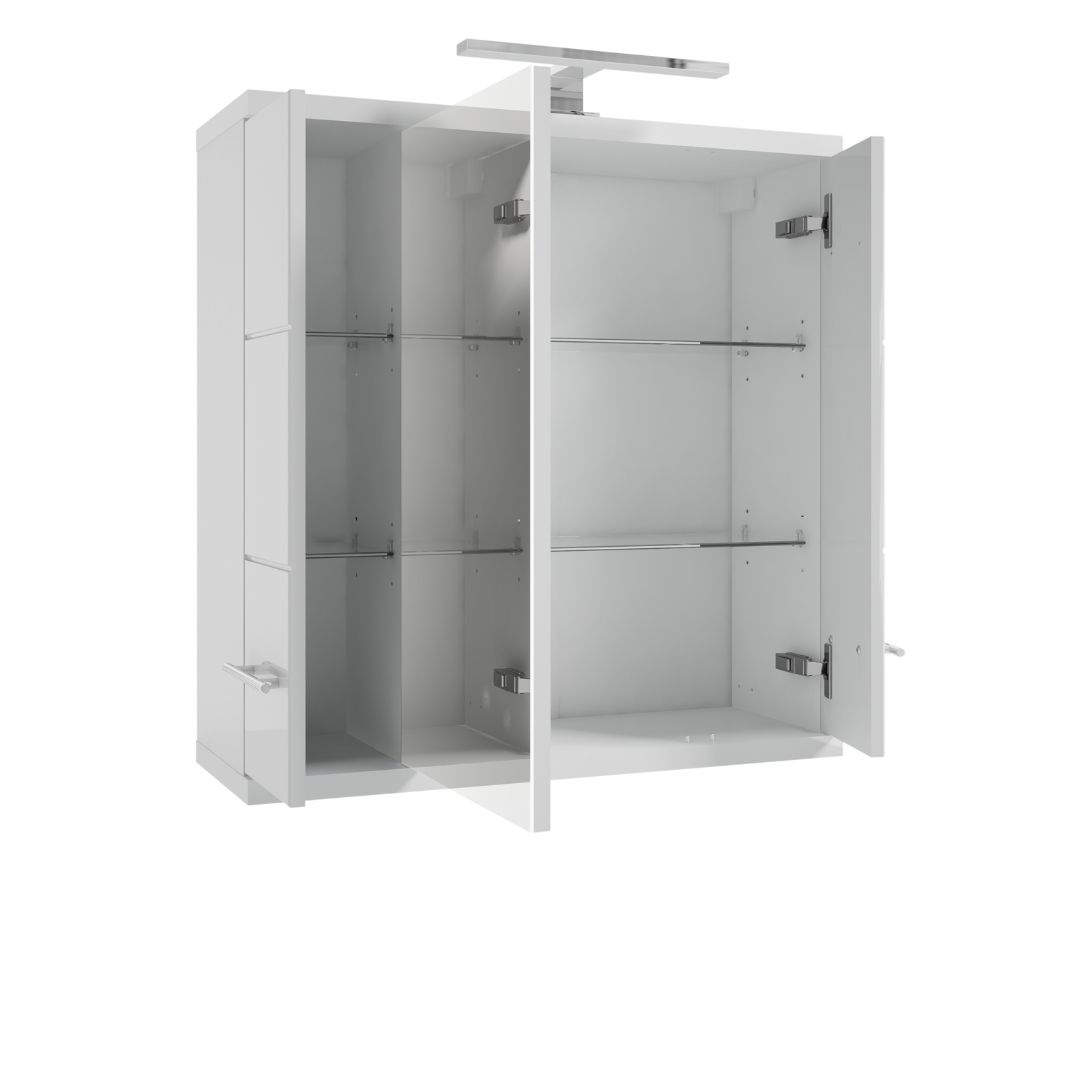 Wall hung mirror cabinet BARI E70 with width 70,1 cm. The cabinet has three doors and internal shelves with adjustable height. The fronts of the cabinet have been finished with a UV resistant lacquer in white gloss. Two doors of the cabinet are made of solid MDF, decorated with decorative milling, giving the cabinet a geometric character. The middle door is a practical mirror. The body is made of white laminated board. The cabinet has practical railing handles.