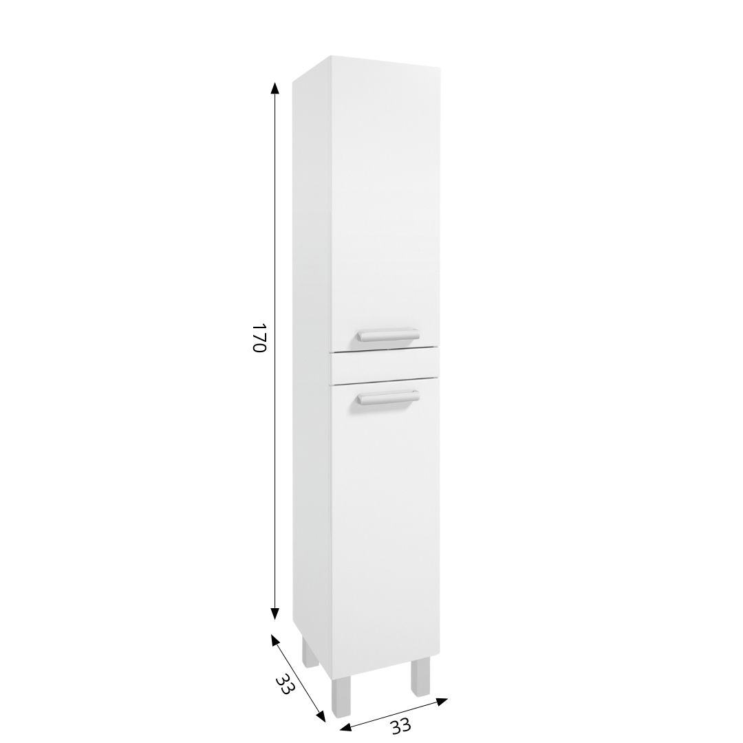 High cabinet on legs CAPRI C32, lacquer white gloss, 32 cm width, pole type. The cabinet has 2 doors and inside shelves with adjustable height. It is equipped with soft closing system DefraSoftClose which increases comfort of everyday use. The cabinet is made of high quality materials, the front and body are lacquered, UV resistant. The cabinet is equipped with chrome rounded handles that increase the comfort of use and aesthetics and chrome square legs. It is possible to mount the cabinet doors so that they open to the right or to the left, as needed.