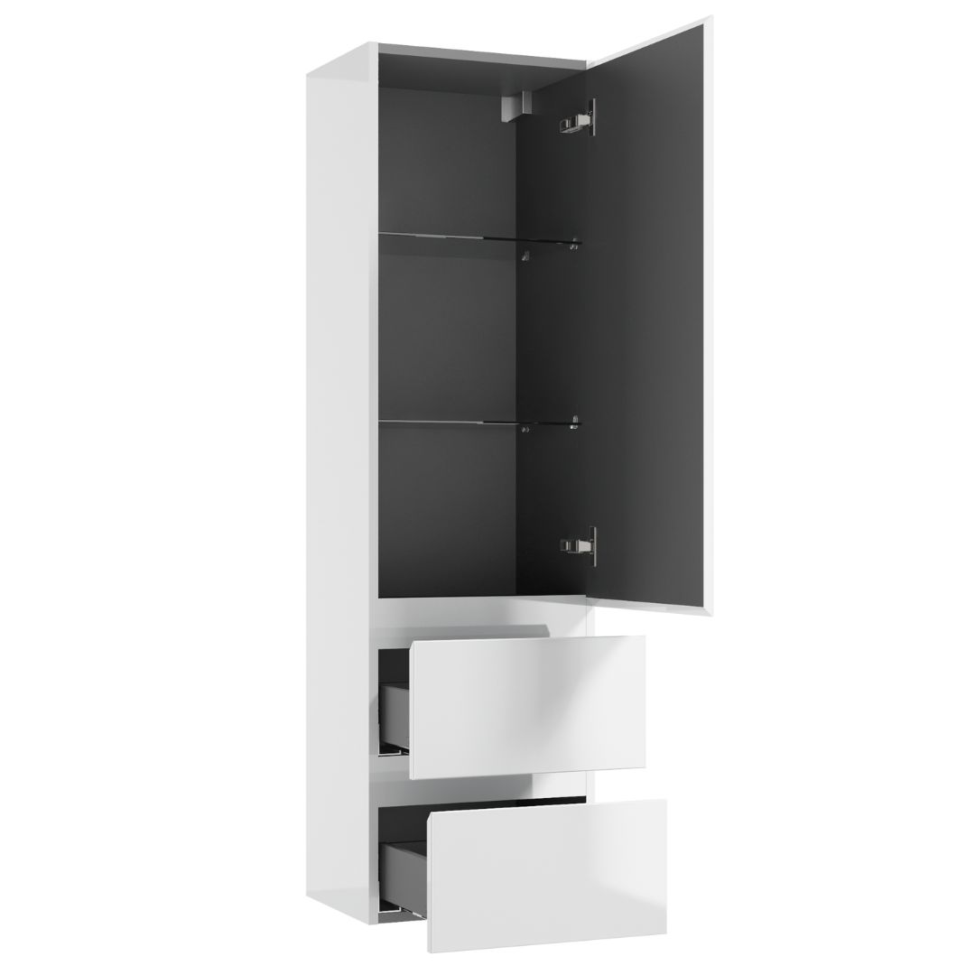 The door and drawers of this tall cabinet COMO C40 are equipped with our original DefraSoftClose system which ensures a gentle and quiet usage. Easily regulated hanger ensures quick and effortless mounting of the piece on your bathroom wall. Fully adjustable glass shelves hidden behind the door of this cabinet in addition to the milled edges serving as an alternative to classic handles make the whole item radiate the aura of refined elegance. If needed, the door can be installed to open either to the right or to the left. Straightforward yet sophisticated form of the cabinet fits perfectly into modern minimalistic bathrooms though any interior based on bold angles and simplicity is a perfect place to include this cabinet.High quality light-hardened lacquer guarantees an incredible degree of durability and successfully prevents erosion due to sunlight. Internal lacquering, which is used in this cabinet, additionaly allows for easy cleaning and raises the overall quality of the furniture. This item is a part of the COMO collection of modular furniture and looks best accompanied by its other pieces.