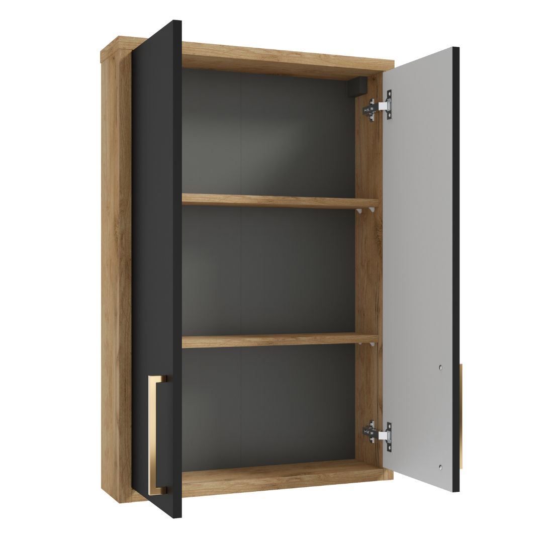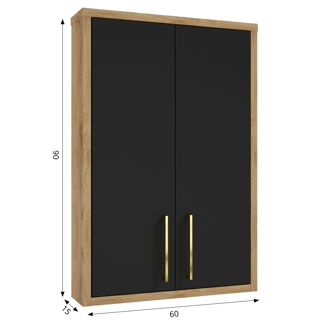 “EMPOLI A60 wall-hung cabinet with doors. The combination of high-quality varnish and timeless wood decor increases the aesthetic value of the cabinet. The fronts of the cabinet are covered with a matte black varnish with a special NO FINGERPRINT coating to prevent leaving unsightly fingerprints. The bodies are made of high-quality laminated board in oak color The shelves inside the cabinet can be adjusted in height to meet the user’s needs.
