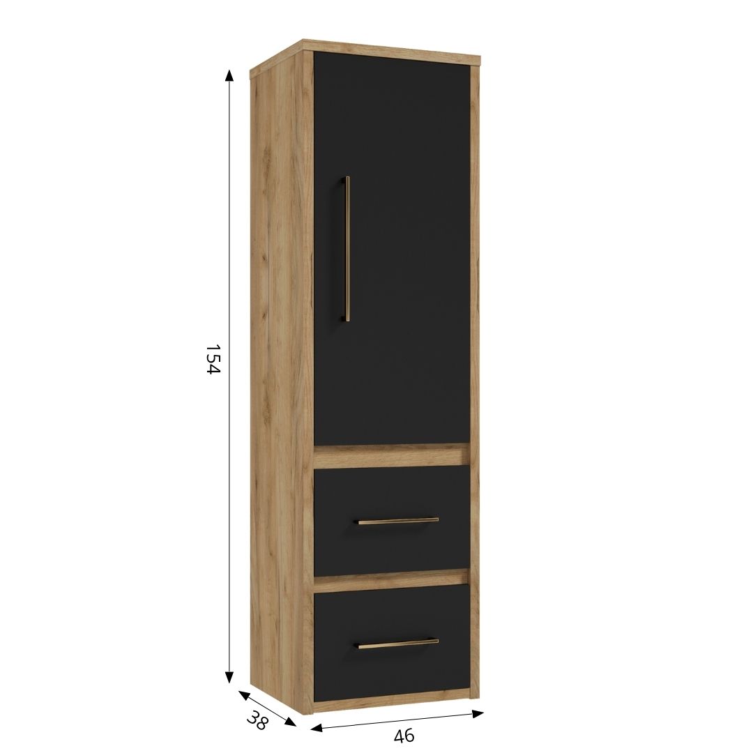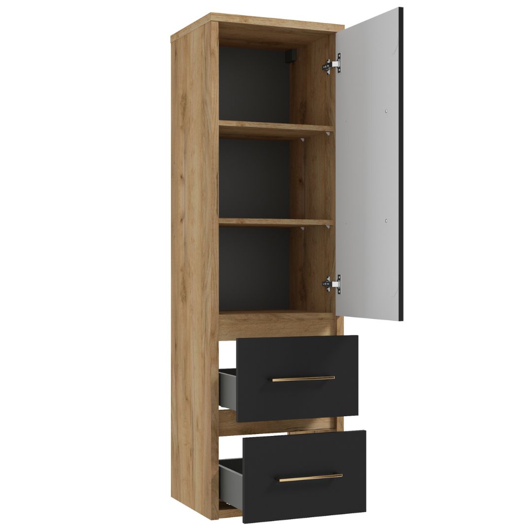 EMPOLI C45 hanging pillar with doors and two drawers. The combination of high-quality varnish with a timeless wood decor increases the aesthetic value of the cabinet. The fronts of the cabinet are covered with a matte black varnish with a special NO FINGERPRINT coating that prevents leaving unsightly fingerprints. The bodies are made of high-quality laminated board in golden oak color. Shelves inside the cabinet are height adjustable to meet the user’s needs. This deep column will fit both towels and other bathroom accessories.