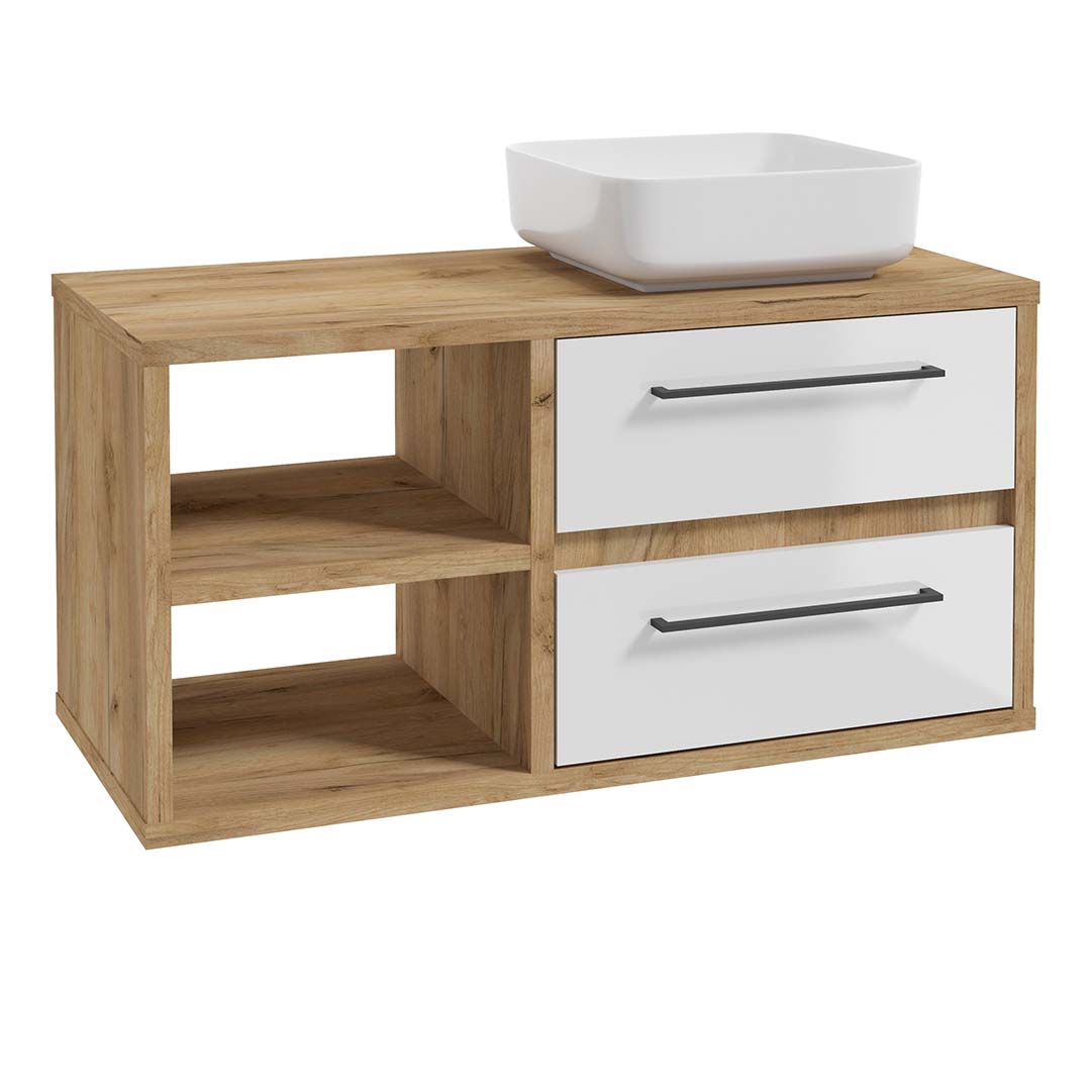 The EMPOLI D100 hanging cabinet under the washbasin consists of two drawers equipped with a soft-close function and two open shelves. An interesting color composition of the cabinet is its characteristic feature. The body is made of high-quality laminated board in the color of golden oak, and the fronts are varnished in glossy white. LATTE railing handles beautifully emphasize the geometric form of the furniture.