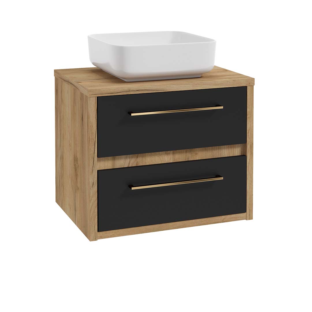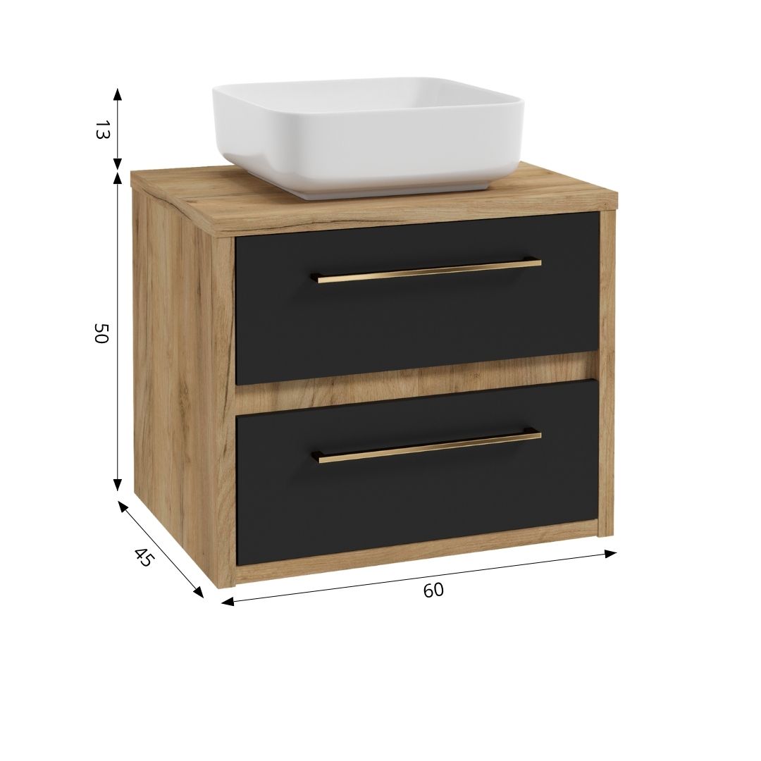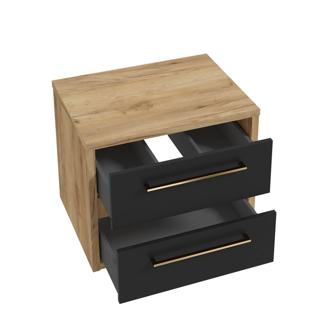 The EMPOLI D60 hanging cabinet under the washbasin consists of two drawers equipped with a soft close function. An interesting color composition of the cabinet is its characteristic feature. The body is made of high-quality laminated board in the color of golden oak, and the fronts are varnished in black mat with a special NO FINGERPRINT coating that prevents leaving unsightly fingerprints. LATTE railing handles beautifully emphasize the geometric form of the furniture.
