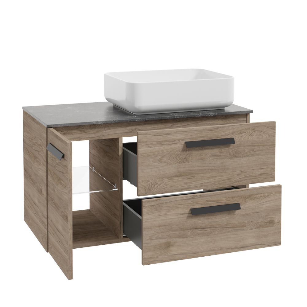 You can combine the Faro D90 under-basin cabinet with drawers with a furniture washbasin or supplement it with a countertop (laminated or conglomerate), on which you can place any selected, matching in size, countertop washbasin. The matching furniture washbasin is Plan 90. Countertops and washbasins are not part of the set, they must be purchased separately.