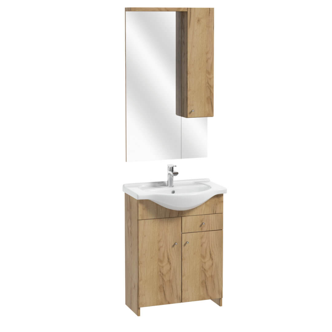 The set of bathroom furniture Malibu D65 without plinth. The set comprises a 61,5 cm wide under-counter cabinet, a mirror with a cabinet and ROBERTO 65 washbasin. The cabinet has two doors and one drawerfor handy accessories. A small cabinet by the mirror is a practical solutionfor handy cosmetics. Inner shelves can be hung at various heights. Fronts of the cabinet were finished with a UV resistant white glossy varnish. The body is made of white laminated board. The cabinet has delicate, single point handles.