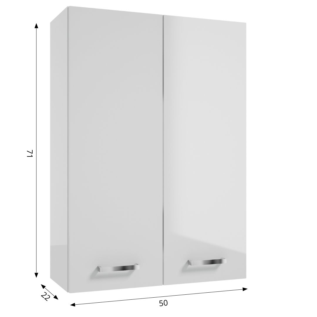 MEA A50 wall hung cabinet with doors and height adjustable inner shelves. Front and body are finished with a UV-resistant white gloss lacquer. The cabinet has comfortable handles.
