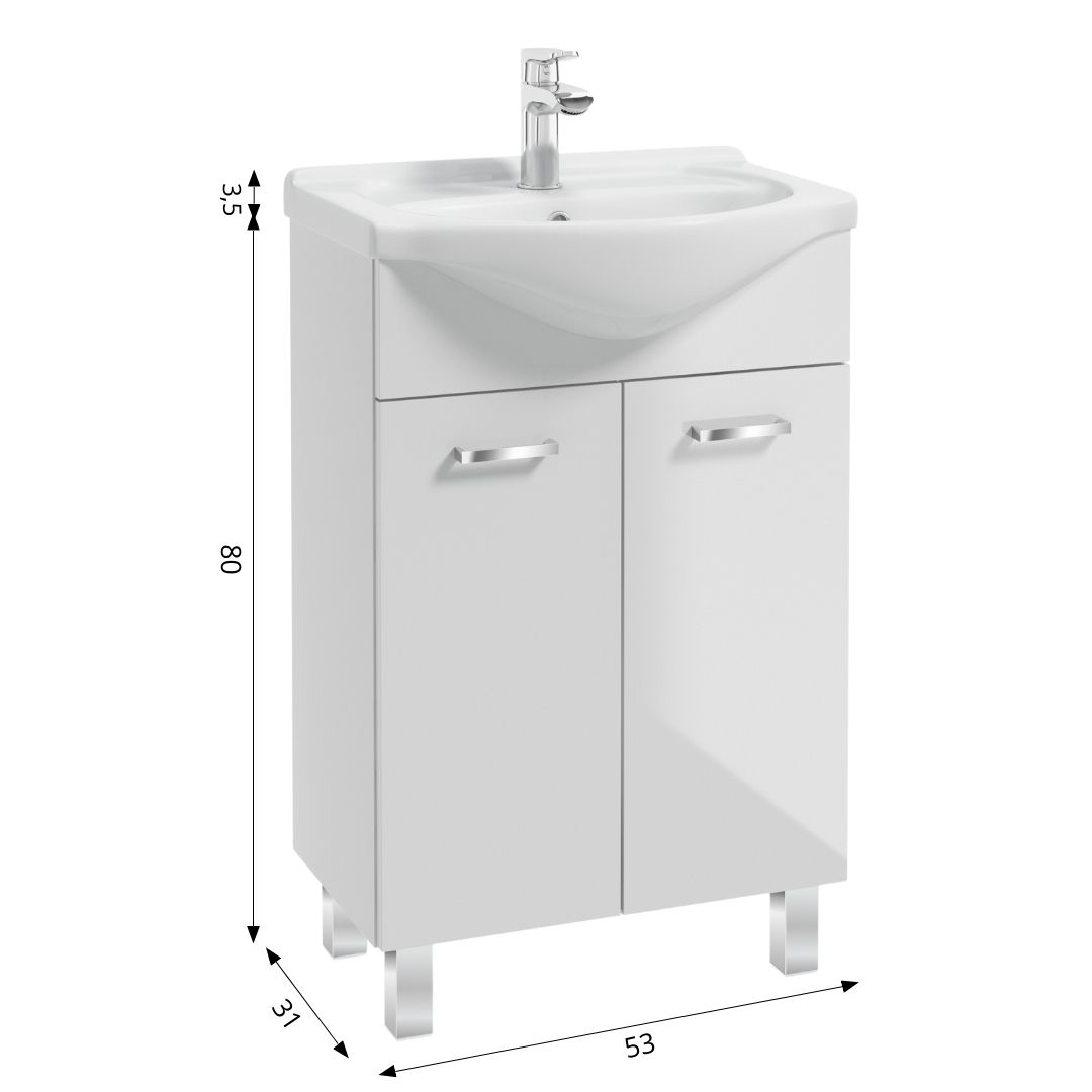 MEA D55 pedestal washbasin cabinet with doors. Light cured lacquer has been applied to both body and fronts in glossy white color. Solid, chromium-plated handles emphasize the individual character of the collection and ensure comfortable use. The cabinet looks perfectly with the dedicated ROBERTO ceramic washbasin, included in the set.