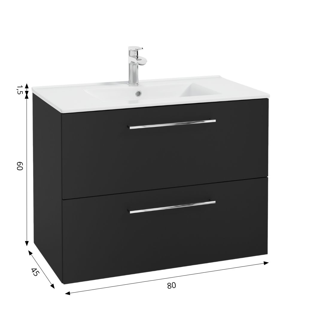 The METRO SYSTEM D80 hanging cabinet under the washbasin consists of two drawers equipped with a soft close function. The high-quality light-curing lacquer used on the body and front increases resistance to solar radiation. LATTE railing handles beautifully emphasize the geometric form of the furniture.