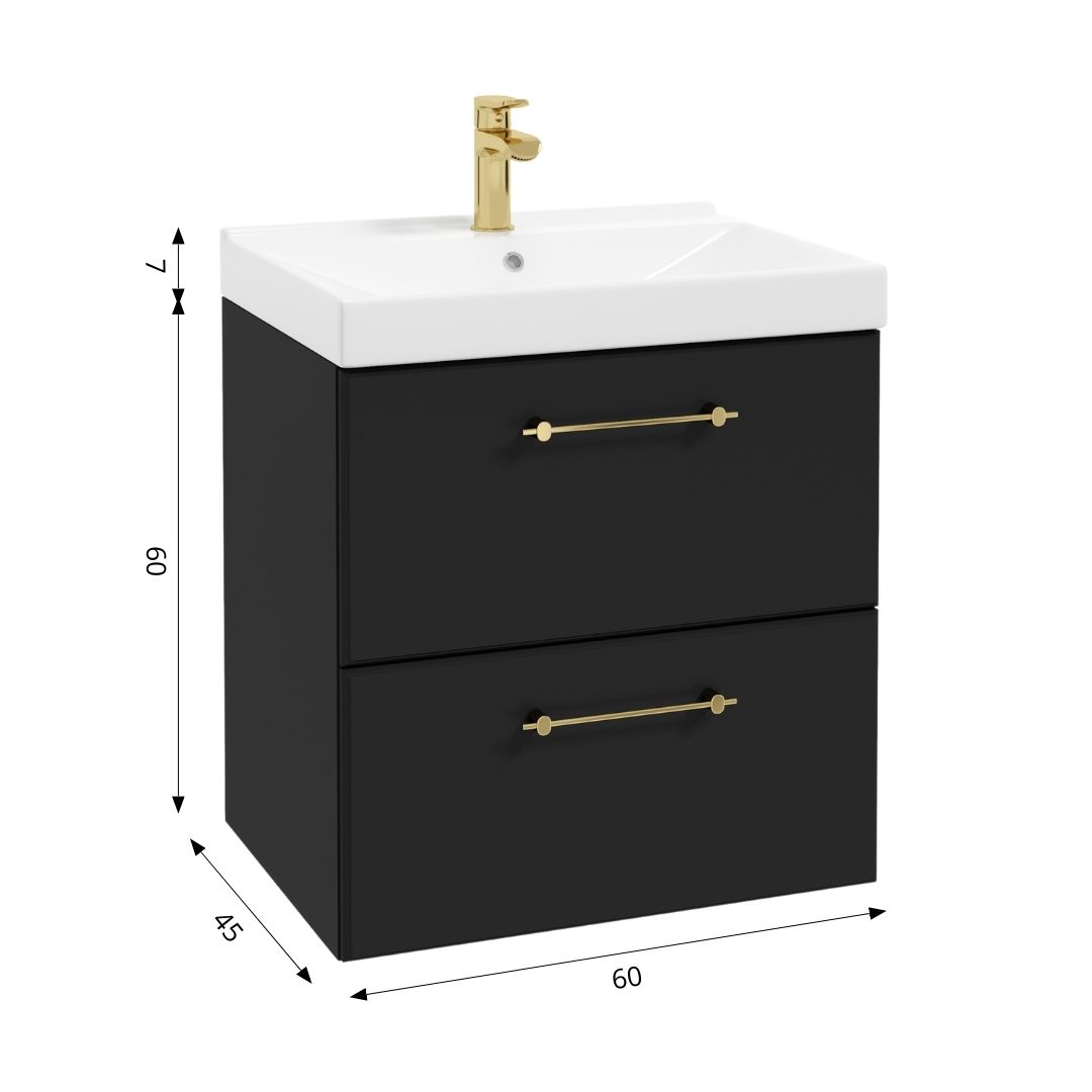Mo-re D60 wall-mounted washbasin cabinet with 2 capacious drawers with soft-closing function. The drawers use full extension guides and metal side walls, and thanks to DefraMax, the usable area of the bottom of the drawer has been increased. The interiors of both drawers are in an elegant graphite color. Easily adjustable hangers make it easy to mount the cabinet on the wall.