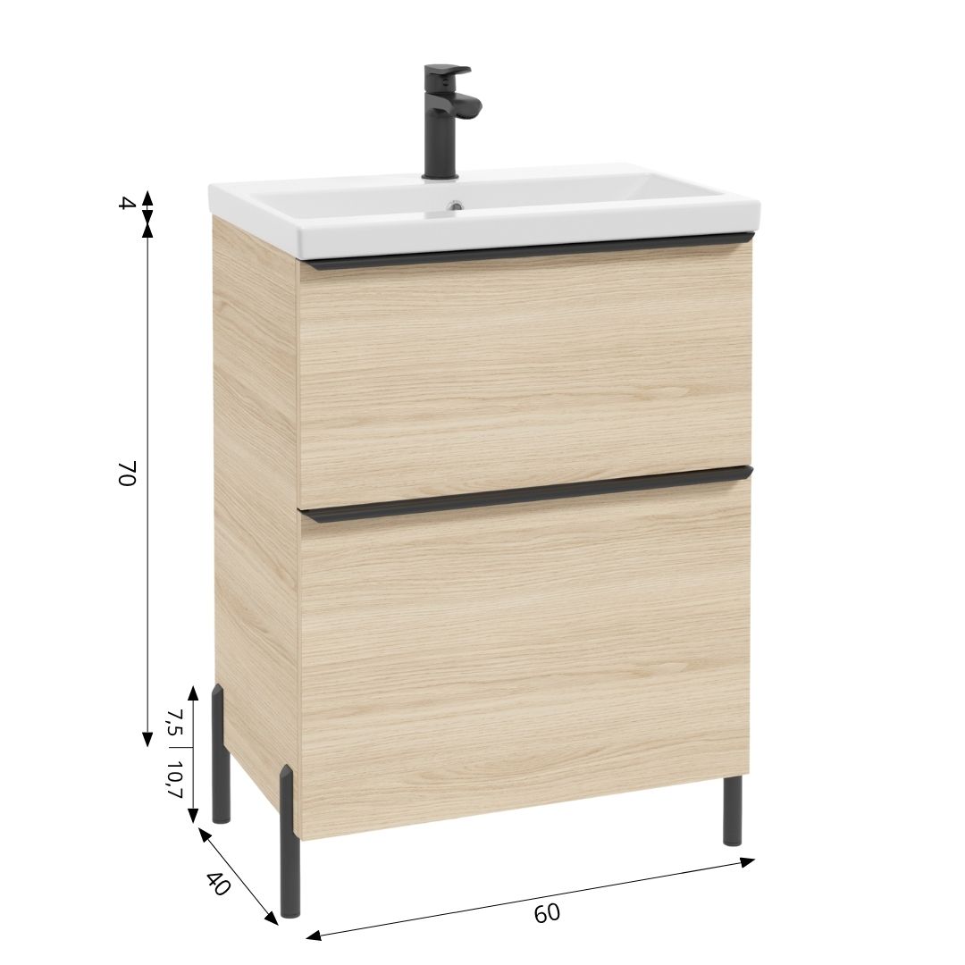 This vanity unit in light Vicenza oak brings coziness and harmony to the bathroom. The wood grain looks very natural, making it a perfect fit for interiors inspired by Japandi, Scandinavian, or boho styles. You can complement the unit with slender legs, adding a touch of lightness to the overall design. Choosing handles from a variety of available options allows you to easily add a personalized touch to the unit.