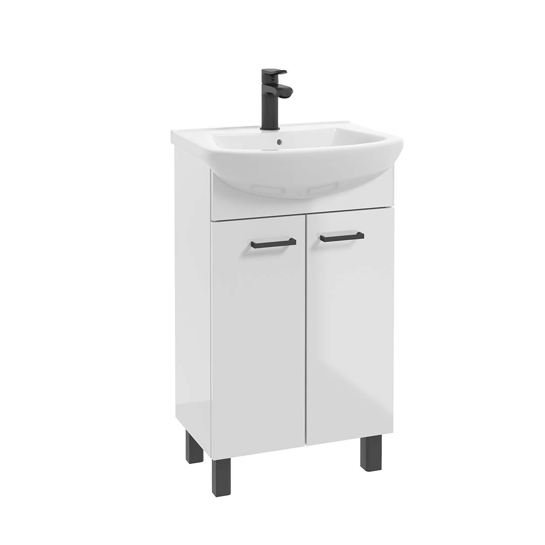 “NOVELTY D50 washbasin cabinet with doors standing on legs. Light-curing lacquer has been applied to both the bodies and fronts in a glossy white color. Solid, black matt handles emphasize the individual character of the collection and ensure comfortable use. The cabinet looks great with the dedicated, TOMASO 50 ceramic washbasin, which is included.