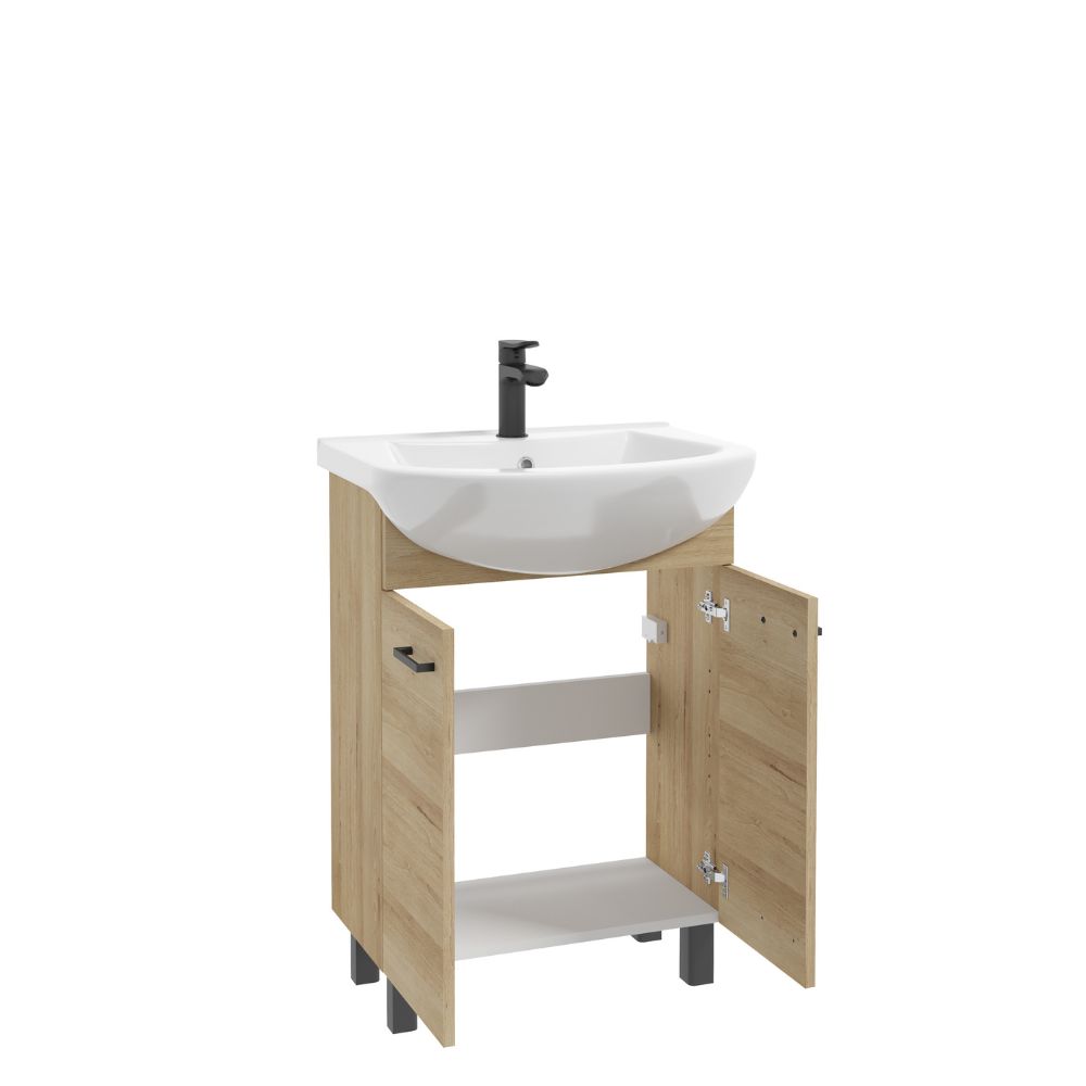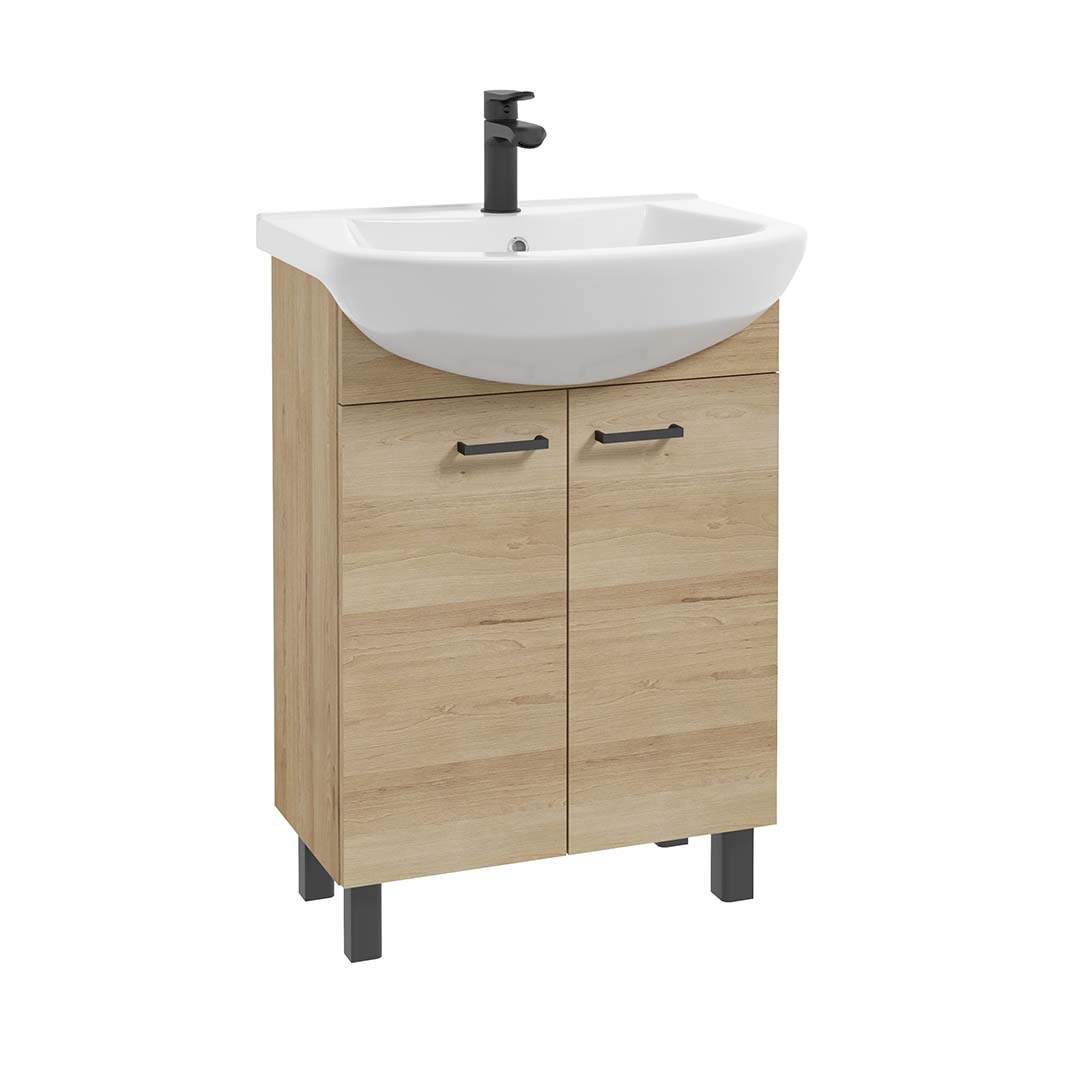 “NOVELTY D60 washbasin cabinet with doors standing on legs. Made of high-quality laminated board in truffle beech. Solid, black matt handles emphasize the individual character of the collection and ensure comfortable use. The cabinet looks great with the TOMASO ceramic washbasin designed for it. 60 which is included.