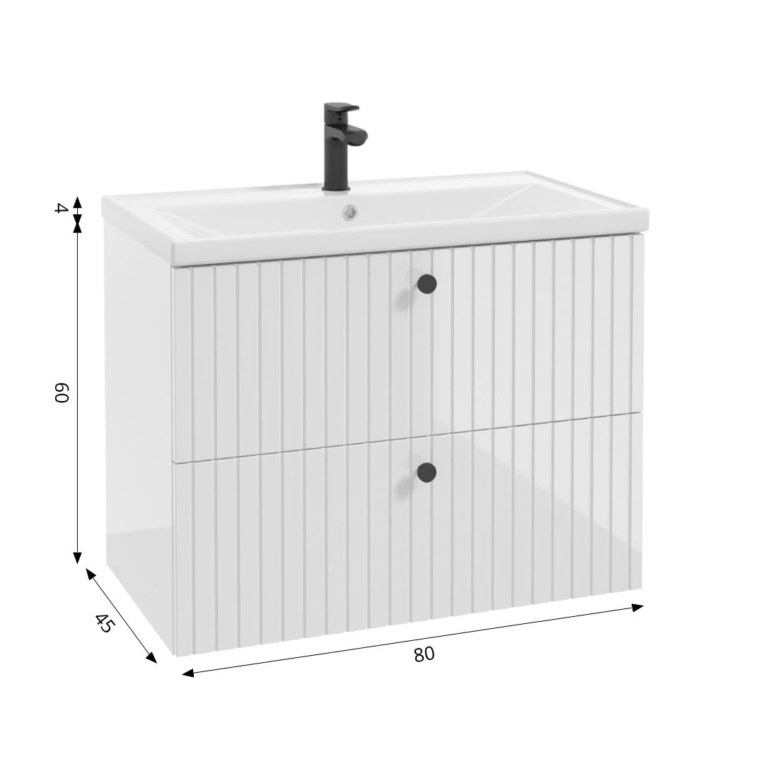 The under-basin cabinet with two drawers Rietti D80 is a perfect combination of style and functionality. Its fronts are decorated with subtle vertical millings, which give the furniture a modern and unique character. The universal design makes the cabinet a perfect match for both modern and classic bathroom arrangements. Delicate, round handles harmoniously blend in with the whole, emphasizing the elegant appearance of the cabinet.