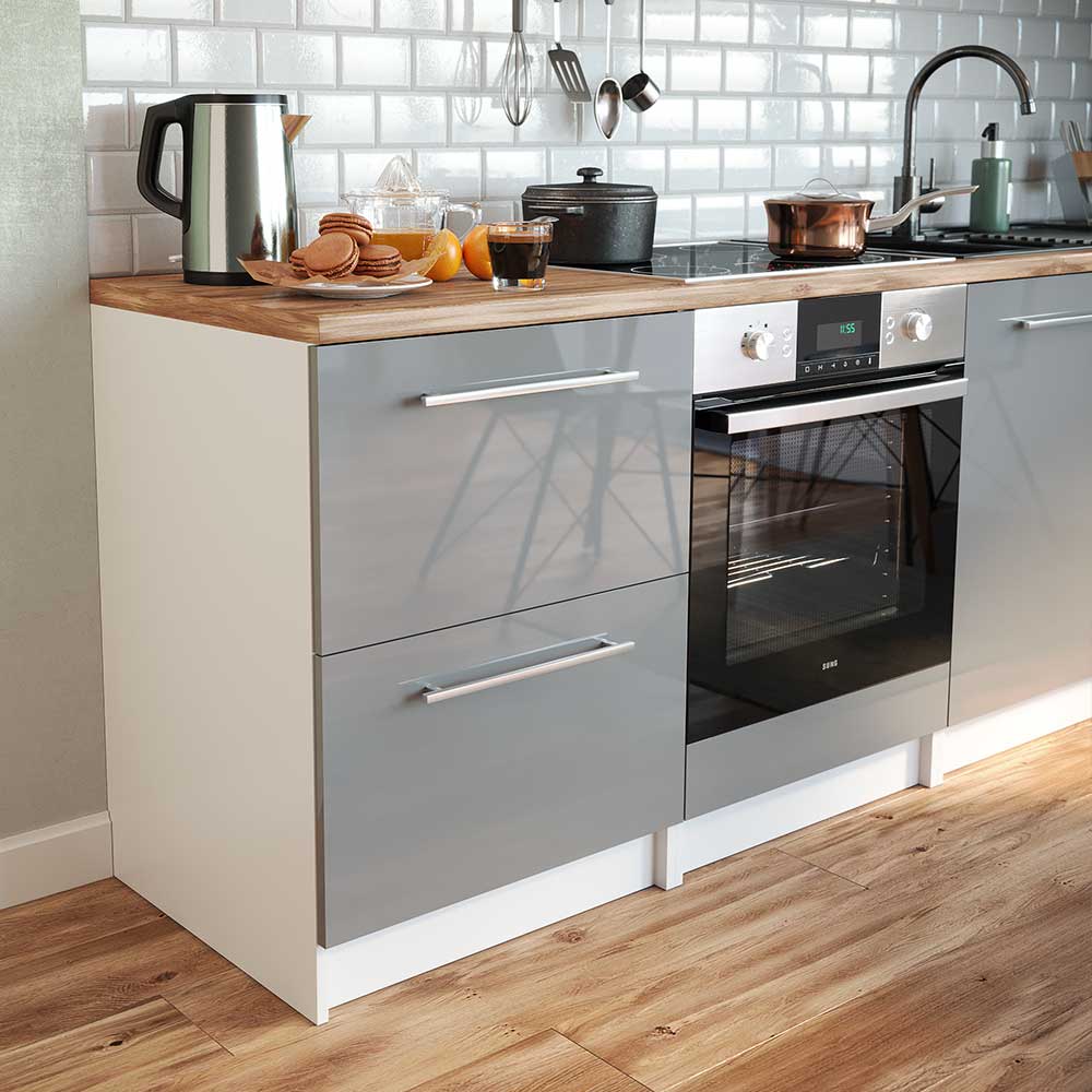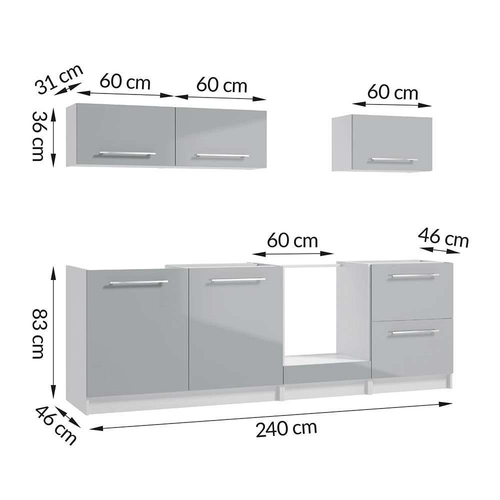 A modern set of kitchen furniture consisting of hanging cabinets with flaps and lower standing cabinets for built-in under the counter. The elegant design of the furniture is due to the minimalist form and timeless solutions. Grey, shiny fronts contrast interestingly with white sides and plinths. Long, horizontal handles made of metal emphasize the subtle style of the collection. The set consists of: