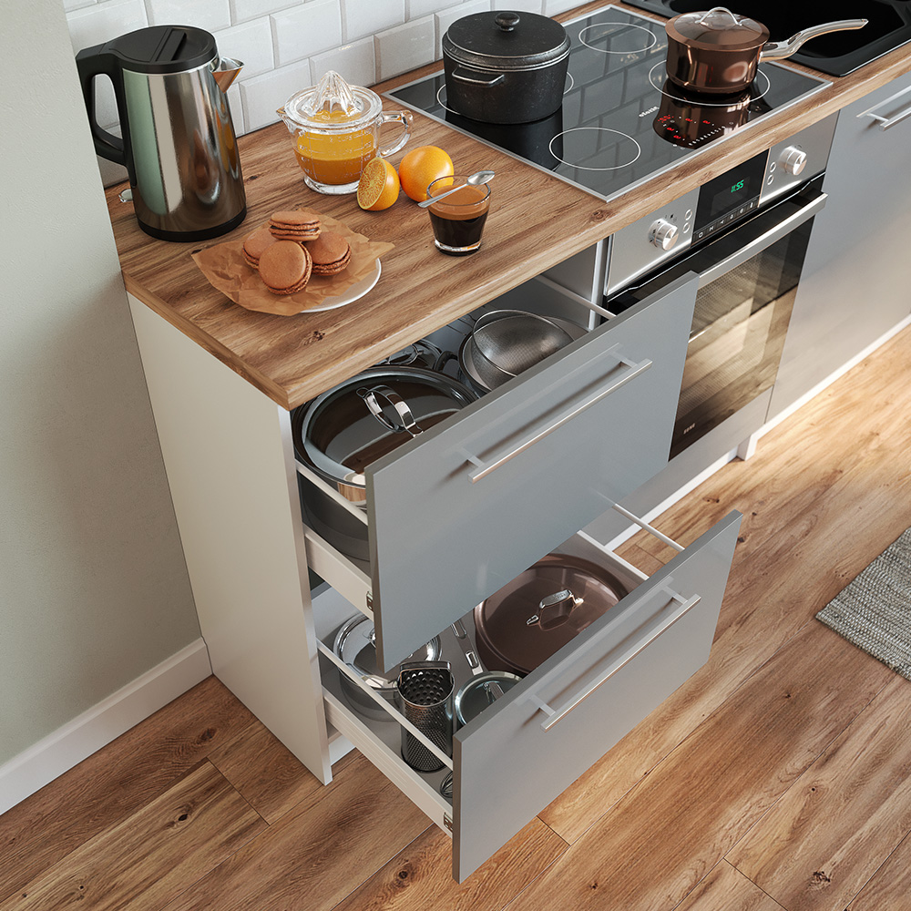 Spacious drawers in the kitchen provide easy access to large items placed inside, such as pots, lids and pans.