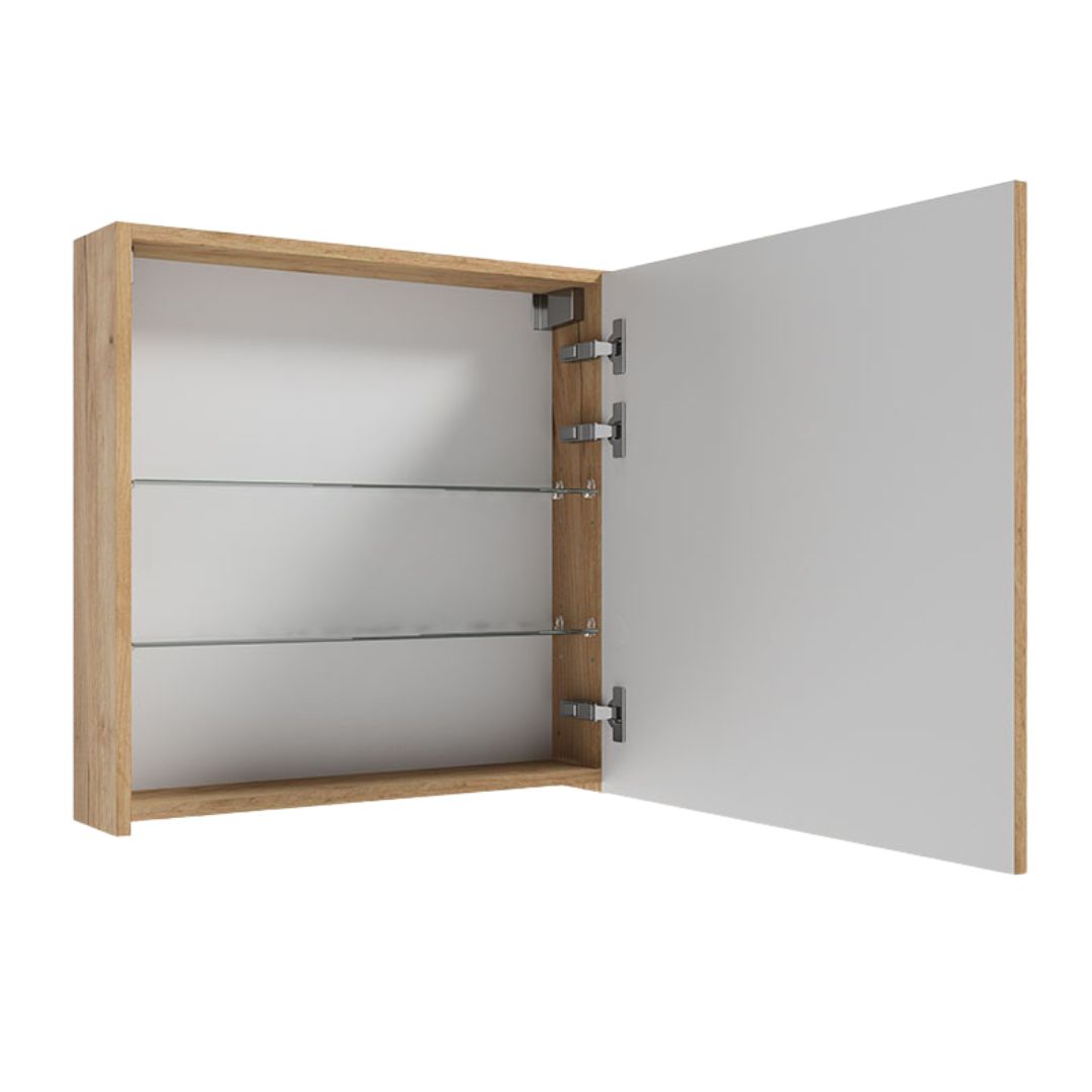 The cabinet’s interior features adjustable glass shelves that allow for convenient height adjustments to accommodate cosmetics and bathroom accessories. The cabinet’s sides are adorned with an “Evoke” oak finish, adding a cozy touch to the bathroom.