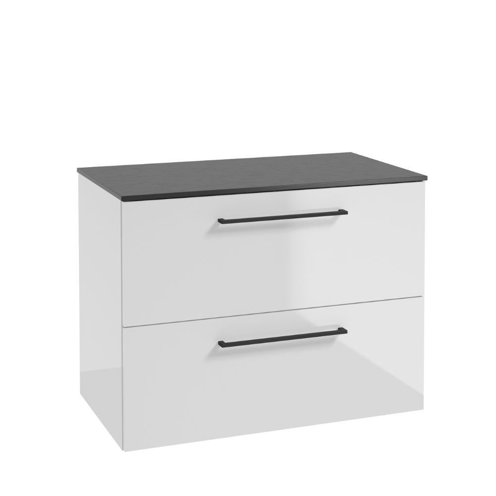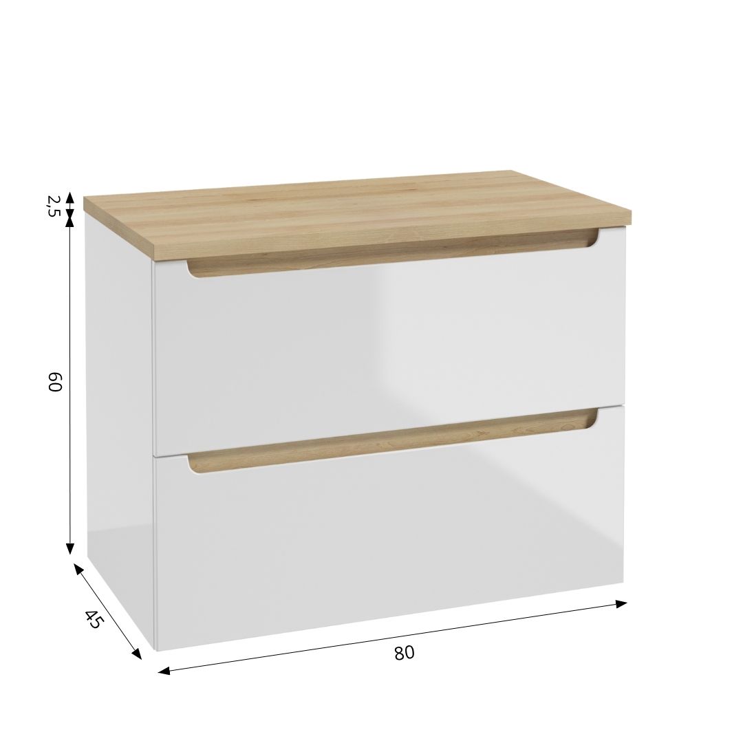 Wall-hung STILLA washbasin cabinet B80 including two drawers enhanced by the addition of the soft-close system. Drawer’s metal sides not only strengthen the construction and increase the aesthetic value but also allow easy maintenance. Full-draw runners allow easy access to every nook and cranny of the drawers. A subtle decorative panel visible behind softly milled handle attracts attention adding to the piece’s unique character. Both the front and the body of the cabinet are covered in high quality UV lacquer, which adds to the piece’s elegant nature as well as its durability. A subtle decorative panel visible behind softly milled handle attracts attention adding to the piece’s unique character. Included with the cabinet are masking panels in three decors: white gloss, black storm and truffle beech which allowfor additional personalization of the cabinets to best suit the bathroom’s interior. Any of these options can bring a subtle personal touch to your uniquely designed space.