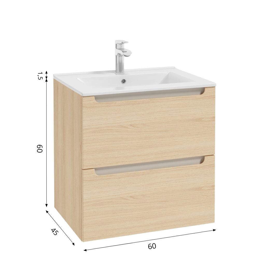 The cabinet can be combined with a countertop and a countertop sink or a vanity sink. Matching furniture washbasins include PLAN 60, ZEEN 60, VERSO 60, NANU 60, and PURO 60. The washbasins are not included and must be purchased separately.