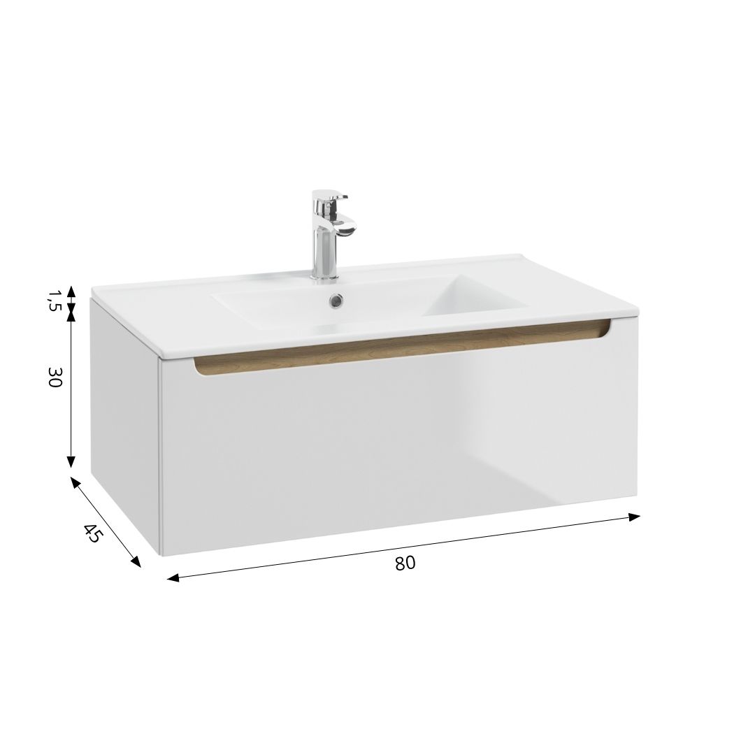 Wall-hung STILLA washbasin cabinet D80 with a single drawer enhanced by the addition of the soft-close system. Drawer’s metal sides not only strengthen the construction and increase the aesthetic value but also allow easy maintenance. Full-draw runners allow easy access to every nook and cranny of the drawers. A subtle decorative panel visible behind softly milled handle attracts attention adding to the piece’s unique character. Both the front and the body of the cabinet are covered in high quality UV lacquer, which adds to the piece’s elegant nature as well as its durability. A subtle decorative panel visible behind softly milled handle attracts attention adding to the piece’s unique character. Included with the cabinet are masking panels in three decors: white gloss, black storm and truffle beech which allowfor additional personalization of the cabinets to best suit the bathroom’s interior. Any of these options can bring a subtle personal touch to your uniquely designed space.