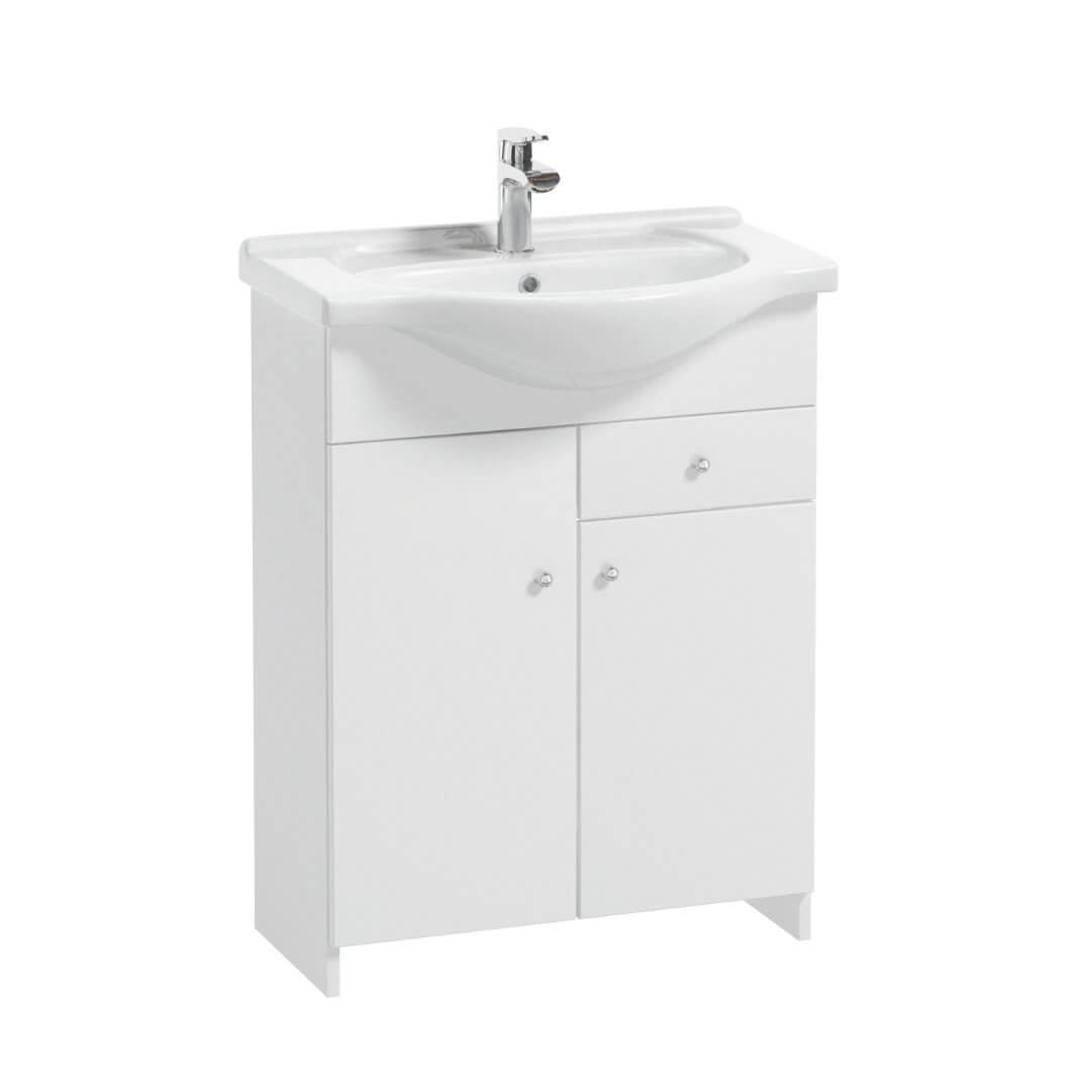 VENUS D65 washbasin cabinet, 61.5 cm wide, without a base. The cabinet has a drawer and two doors. Delicate single-point handles give the cabinet a traditional character. The doors are covered with white, glossy and light-cured lacquer. Fronts are made of white laminated board. It looks perfectly with ROBERTO 65 washbasin which is included in the set.