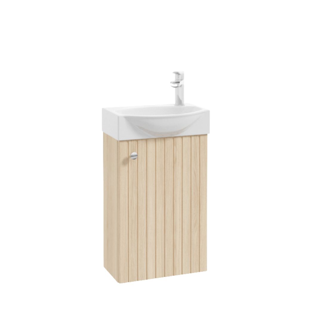 The Vetti D40 vanity unit is the perfect solution for very small bathrooms where every centimeter counts. With a width of 40 cm and a shallow depth of just 22 cm, it easily fits even in a narrow alcove or a small toilet. Despite its compact dimensions, it provides practical storage for small items you’d always like to have close at hand. The unit can be equipped with one of two sinks – the Tummy 40 or the Club 40.